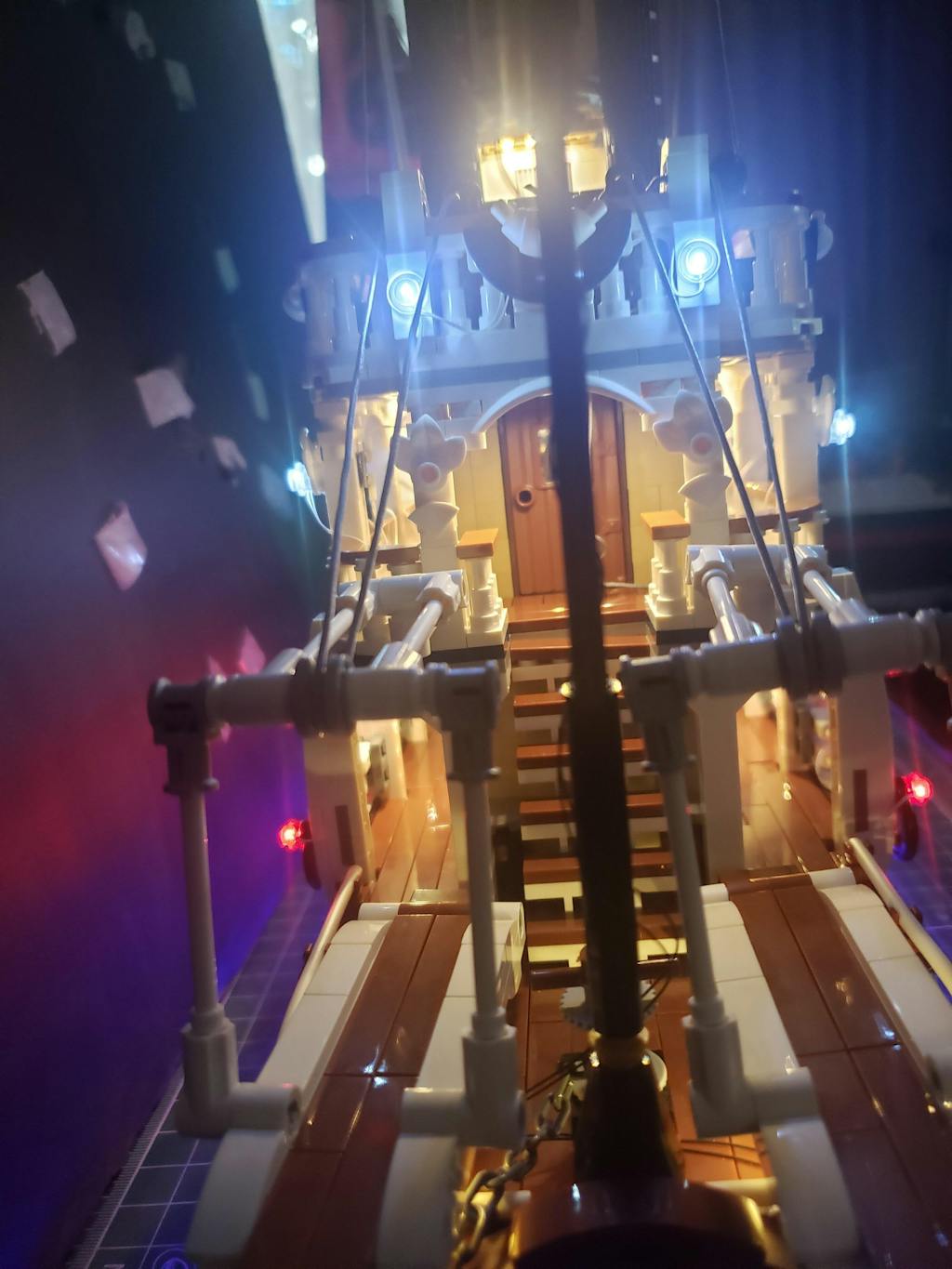 Die Außenseite des Dampfschiffs ist gelb beleuchtet. Die Farbgebung ist hauptsächlich in Dunkelbraun und Beige gehalten und wirkt dadurch sehr retro und verströmt die industrielle Atmosphäre des 19. Jahrhunderts. Gleichzeitig reflektiert das blaue Licht die Unterseite des Segels und erzeugt so eine typische Holzrumpfstruktur. Dies verleiht dem gesamten Schiff einen dreidimensionalen Eindruck und lässt es zugleich antik und elegant wirken.