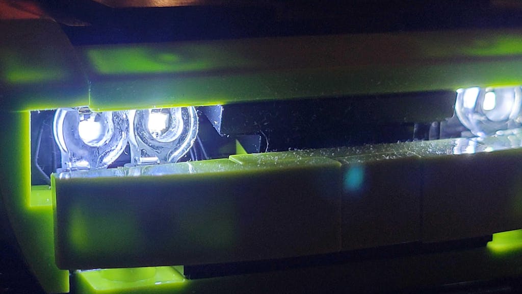 Bei Einbruch der Dunkelheit strahlen die Scheinwerfer ein kühles, weißes Licht aus und durchdringen so die Dunkelheit. Die fluoreszierende grüne Karosserie wird durch die Scheinwerfer akzentuiert, während die sanfte Innenbeleuchtung die Cockpitdetails deutlich sichtbar macht – eine Erinnerung an einen echten Rennwagen, der ruhig auf das Startsignal wartet.