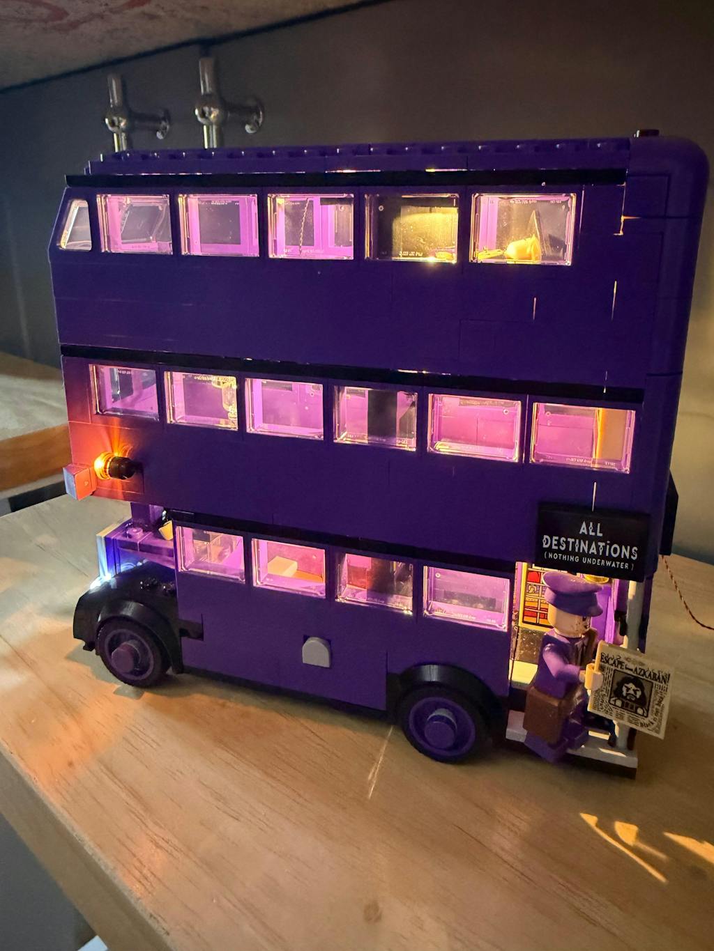 Inspiré du Magicobus du film « Harry Potter et le Prisonnier d'Azkaban », l'emblématique bus violet à trois étages a été restauré. Son design extérieur conserve la forme classique du Magicobus et, grâce à ses phares blanc chaud, il peut circuler librement la nuit. Les détails intérieurs, comme le toit amovible, les lits pivotants et les volants rotatifs, sont également illuminés par des lumières blanc chaud, rendant le modèle plus interactif et valorisant.