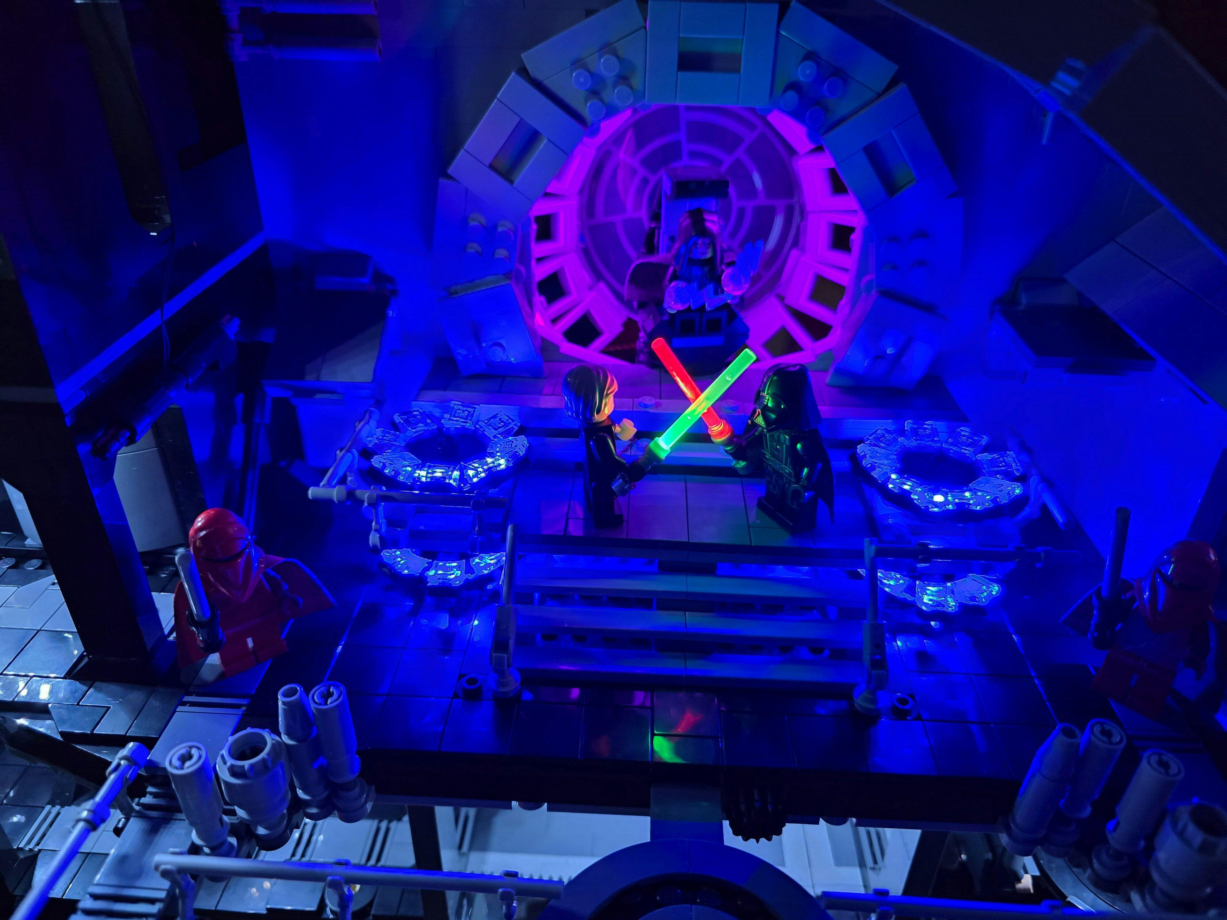 - La lumière est concentrée sur la chaise de l'Empereur et les gardes, soulignant la majesté et le contrôle du côté obscur.